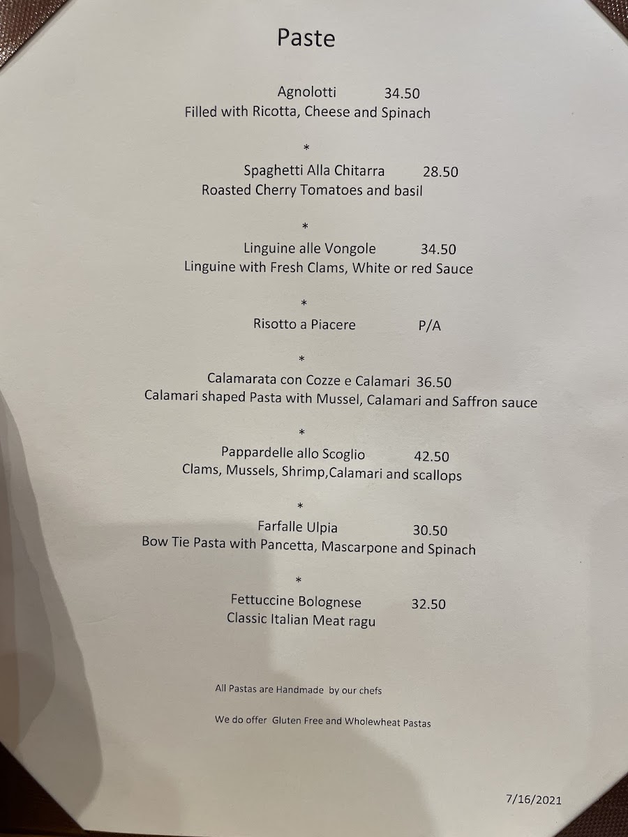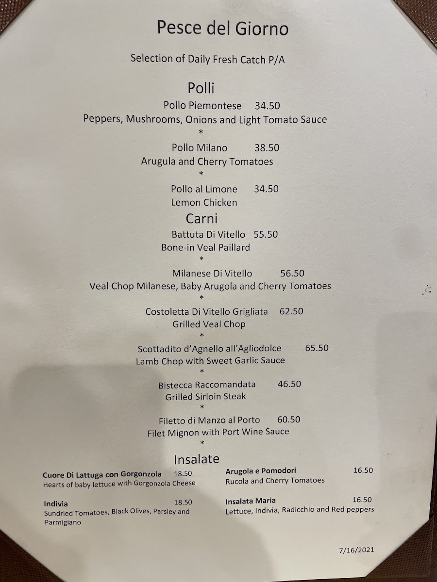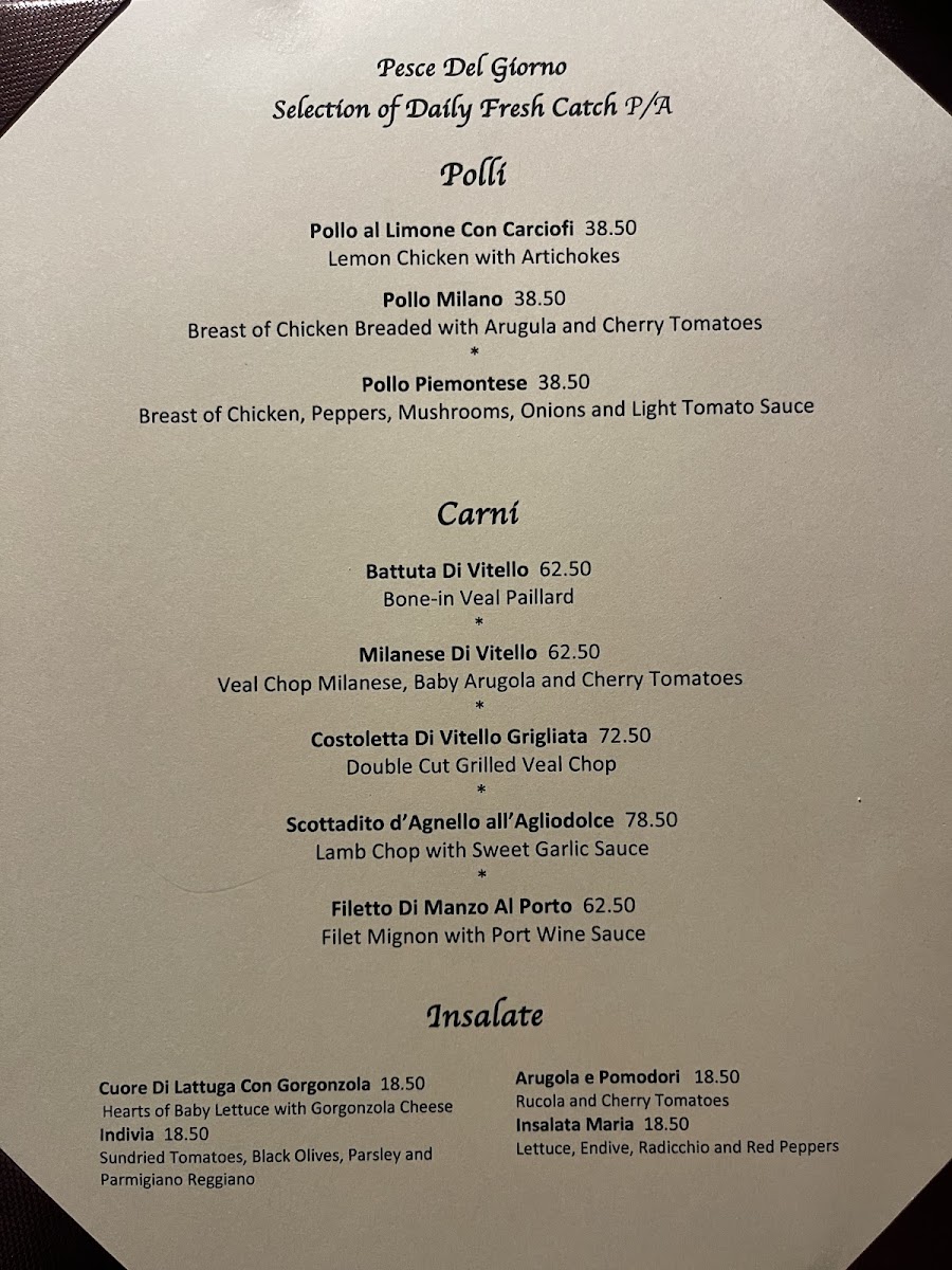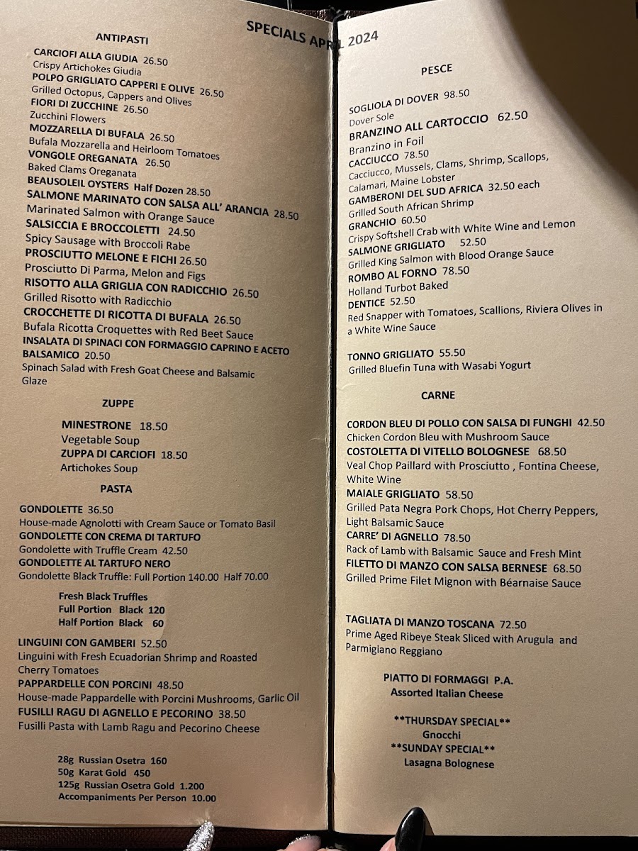 The menu features a variety of options that work well for a leisurely lunch or a relaxed evening meal. From light starters like the Caprese salad with ripe tomatoes and creamy buffalo mozzarella to hearty main courses such as Black Truffle Ravioli or grilled veal chops, there’s a balance of comfort and sophistication. Seasonal seafood dishes and delicately prepared antipasti provide an opportunity to enjoy more vibrant, coastal Italian tastes, perfect for those seeking a thoughtful and satisfying dining pace.