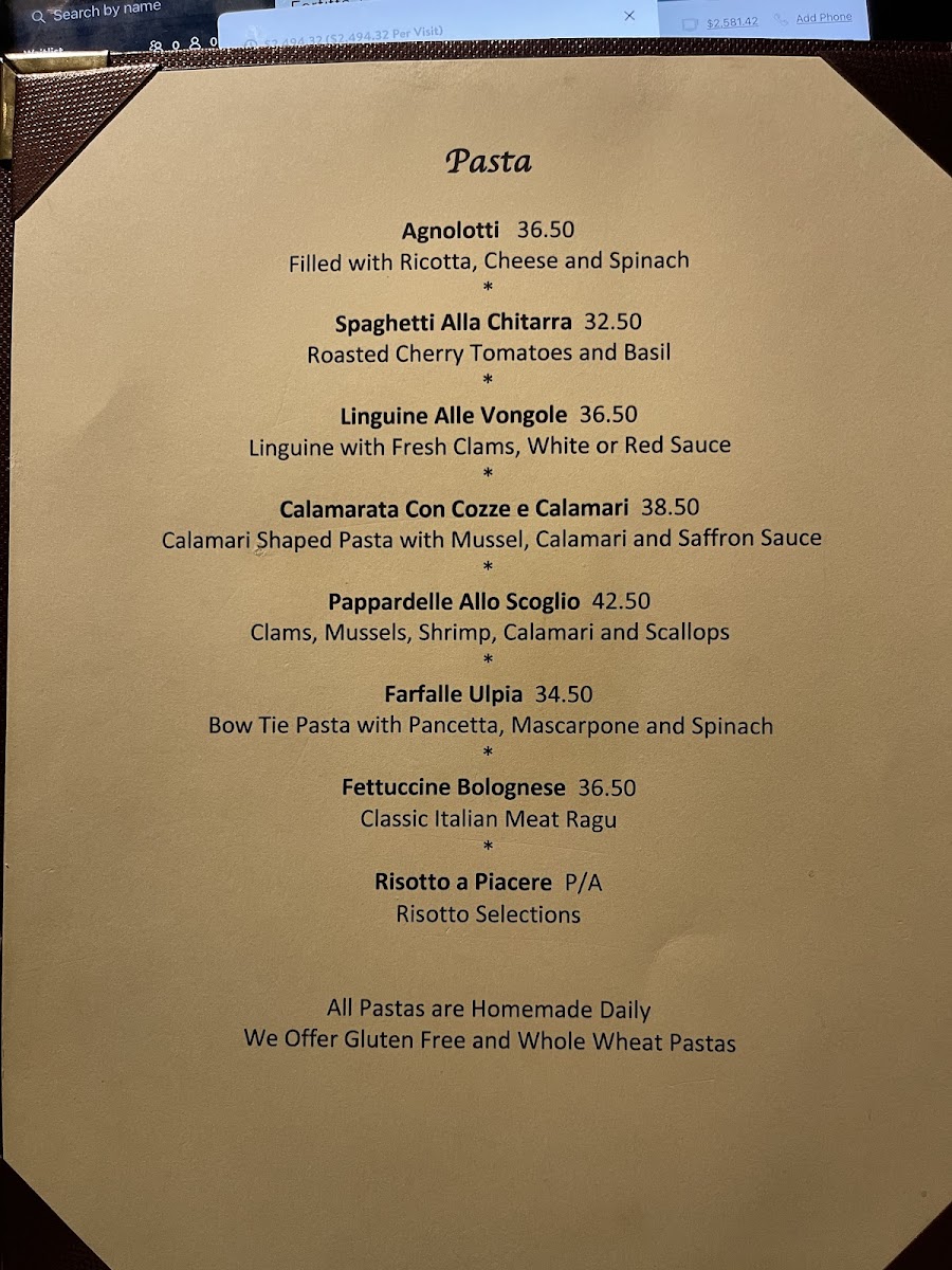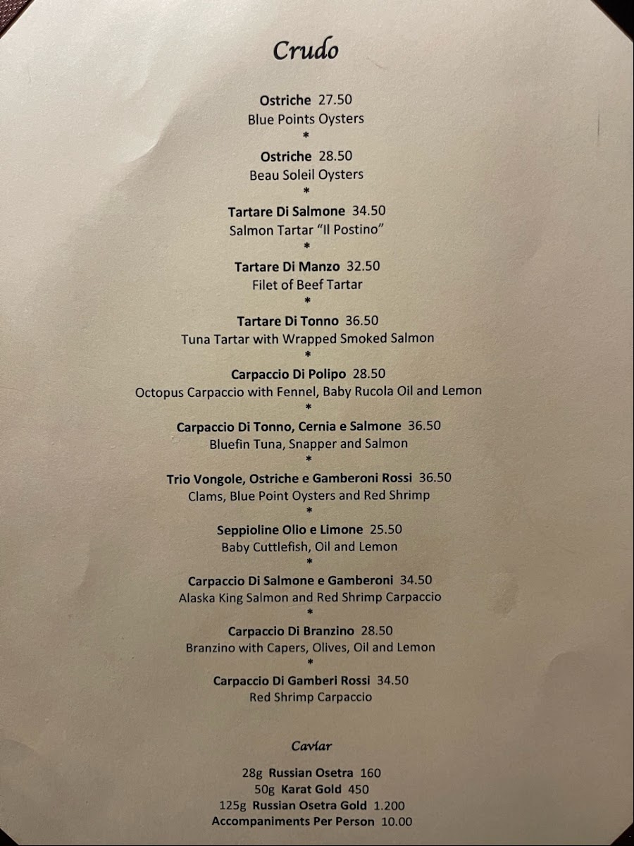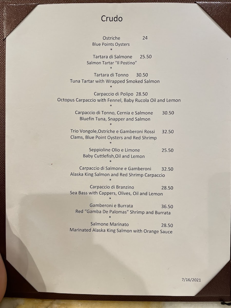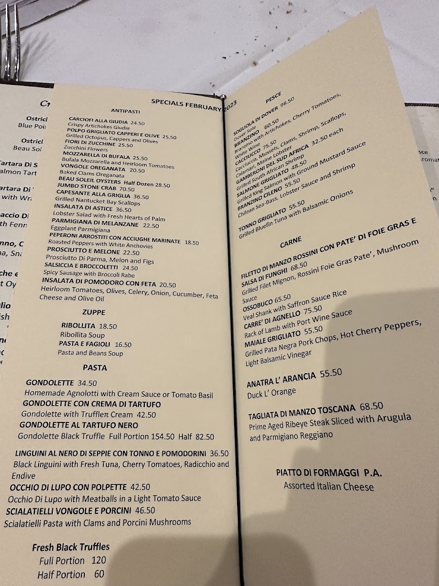 The menu features a variety of options that work well for a leisurely lunch or a relaxed evening meal. From light starters like the Caprese salad with ripe tomatoes and creamy buffalo mozzarella to hearty main courses such as Black Truffle Ravioli or grilled veal chops, there’s a balance of comfort and sophistication. Seasonal seafood dishes and delicately prepared antipasti provide an opportunity to enjoy more vibrant, coastal Italian tastes, perfect for those seeking a thoughtful and satisfying dining pace.